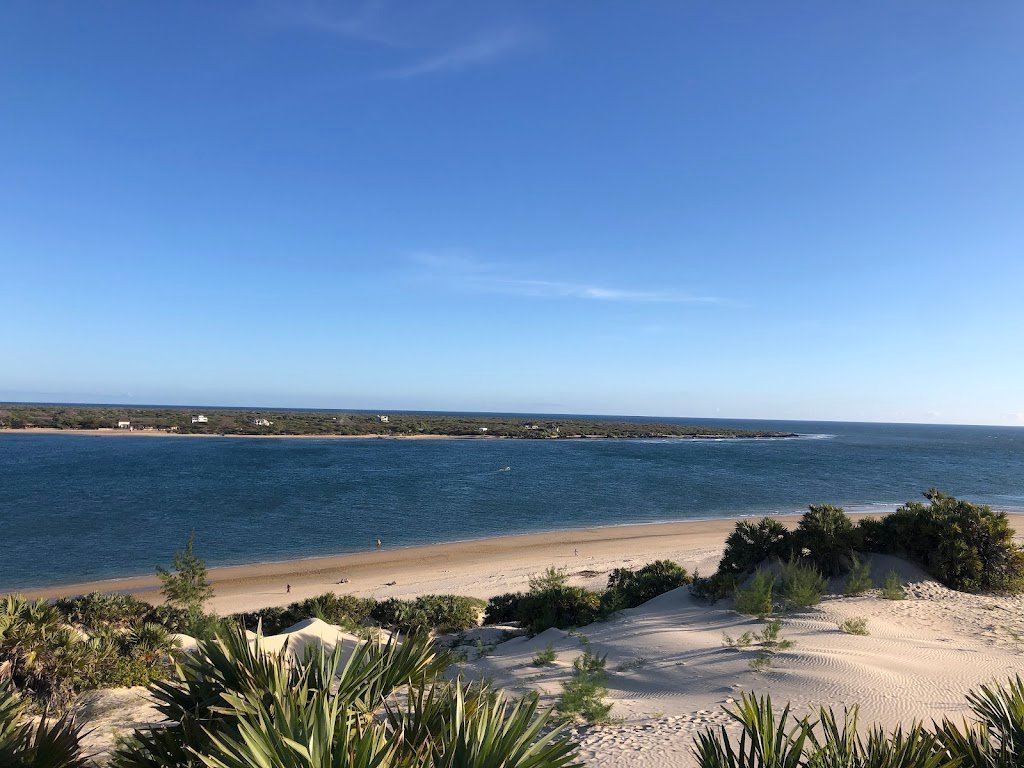 Para pengunjung mengagumi gundukan pasir putih yang indah dan pemandangan pantai yang menakjubkan ke Pulau Manda dan lautan lepas, menjadikannya tempat yang ideal bagi pecinta alam.