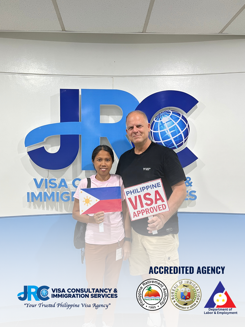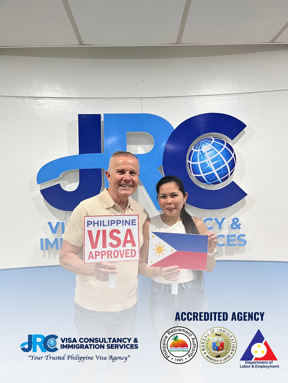 JRC Visa Consultancy is a Philippine government accredited agency and duly authorized to represent you for your visa and immigration needs. Accredited by the Philippine government, JRC Visa Consultancy provides comprehensive visa and immigration services to expats and returning Filipinos. They specialize in tourist visa extensions, Special Resident Retiree’s Visa (SRRV), spousal visas, and other immigration matters. With over 10,000 clients served and a 99.8% visa approval rate, they have offices in Cebu City, Dumaguete, and Metro Manila.